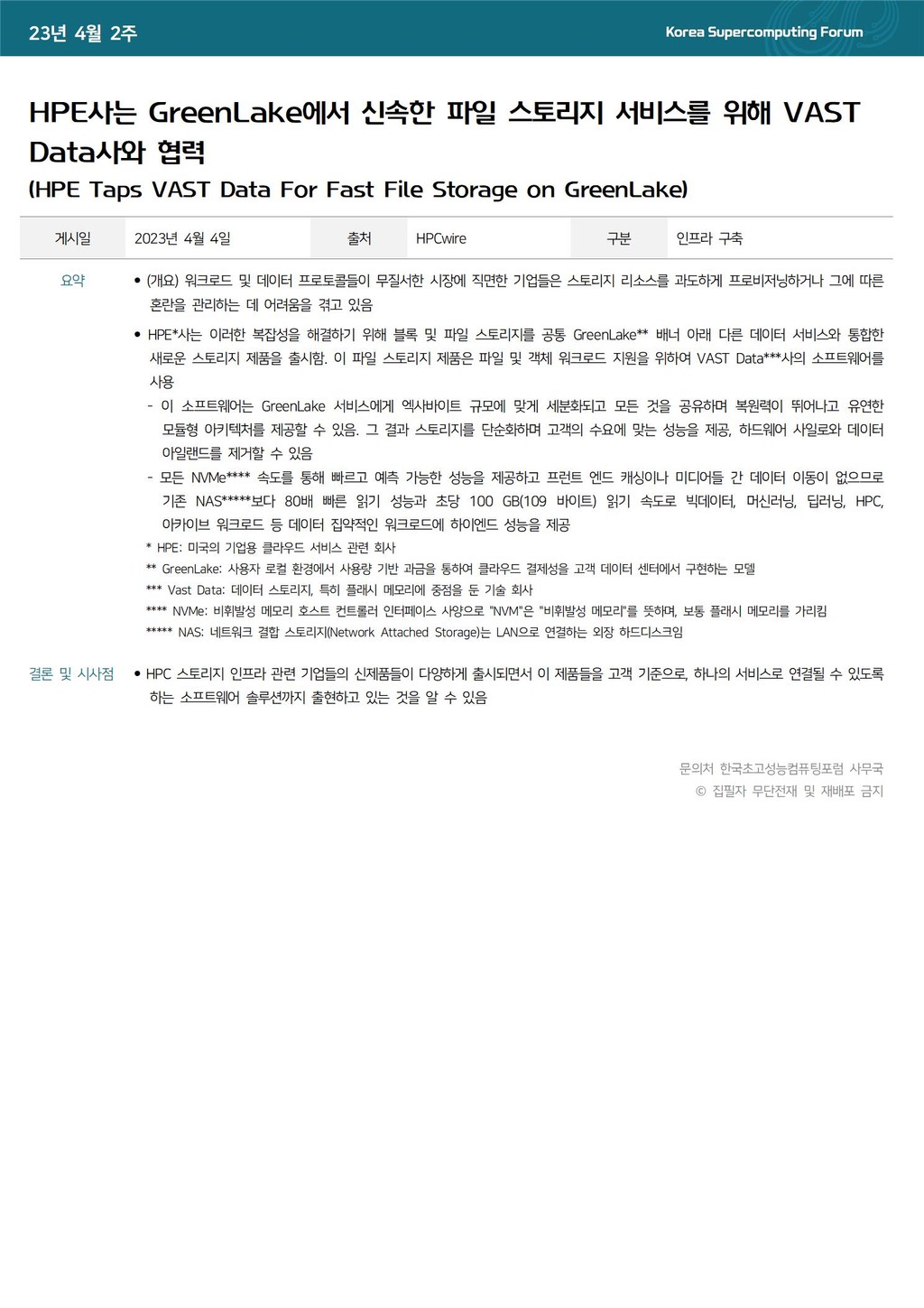 HPE사는 GreenLake에서 신속한 파일 스토리지 서비스를 위해 VAST Data사와 협력