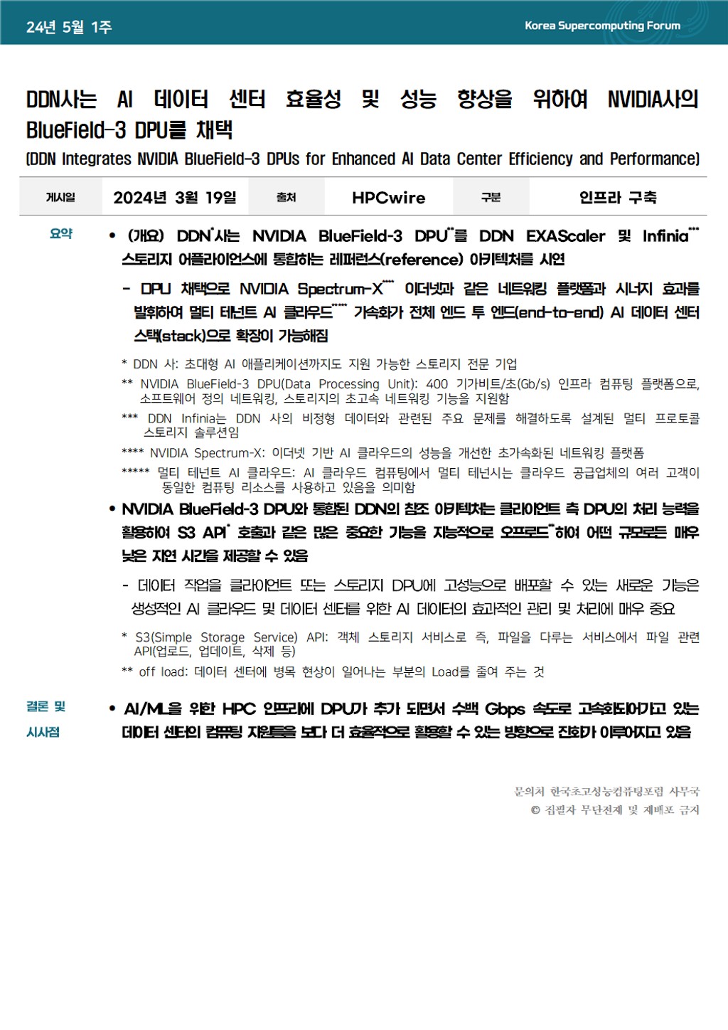 DDN사는 AI 데이터 센터 효율성 및 성능 향상을 위하여 NVIDIA사의 BlueField-3 DPU를 채택