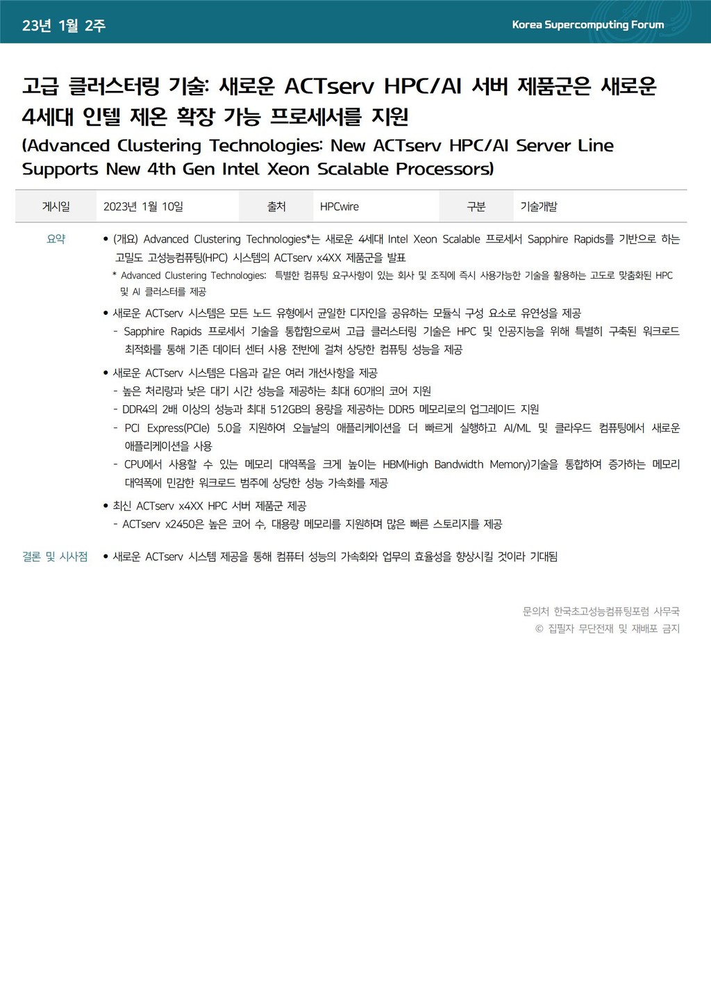 고급 클러스터링 기술: 새로운 ACTserv HPC/AI 서버 제품군은 새로운 4세대 인텔 제온 확장 가능 프로세서를 지원