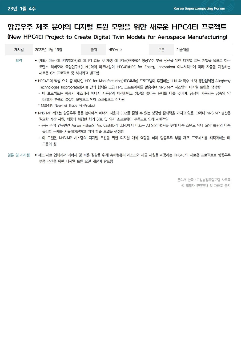 항공우주 제조 분야의 디지털 트윈 모델을 위한 새로운 HPC4EI 프로젝트