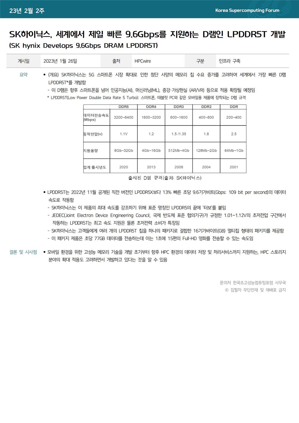 SK하이닉스, 세계에서 제일 빠른 9.6Gbps를 지원하는 D램인 LPDDR5T 개발