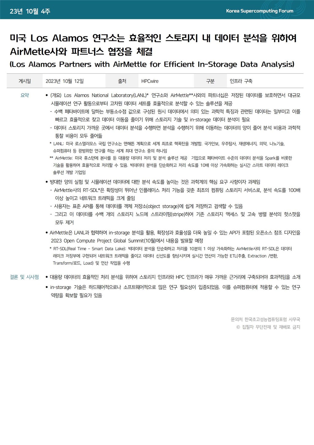 미국 Los Alamos 연구소는 효율적인 스토리지 내 데이터 분석을 위하여 AirMetle사와 파트너스 협정을 체결