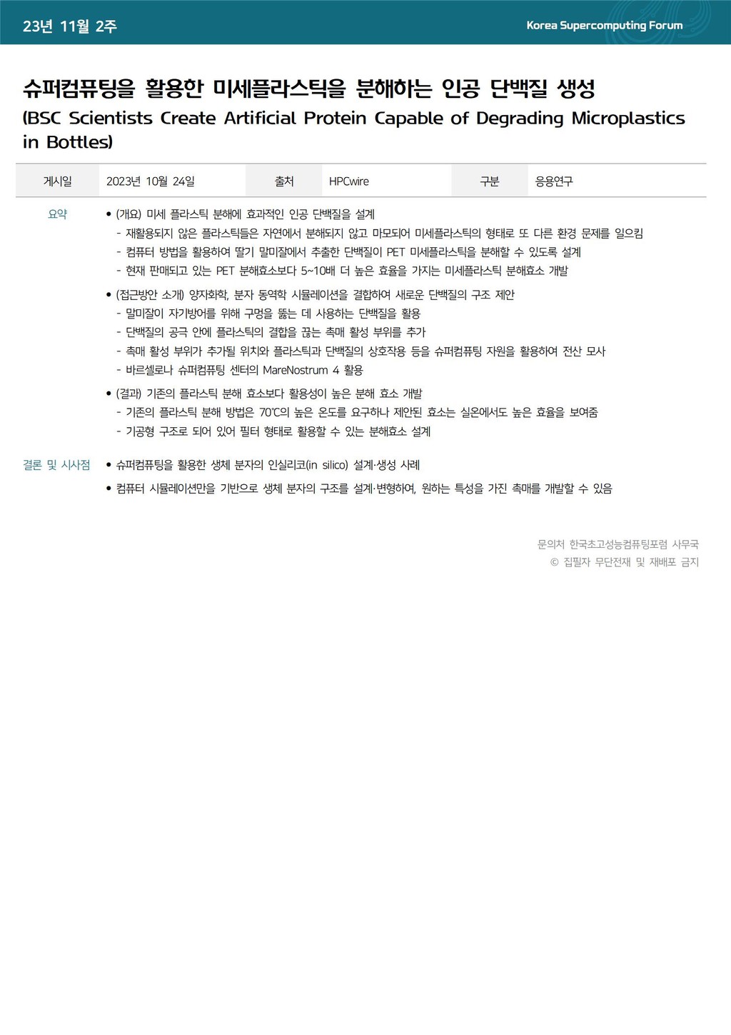 슈퍼컴퓨팅을 활용한 미세플라스틱을 분해하는 인공 단백질 생성