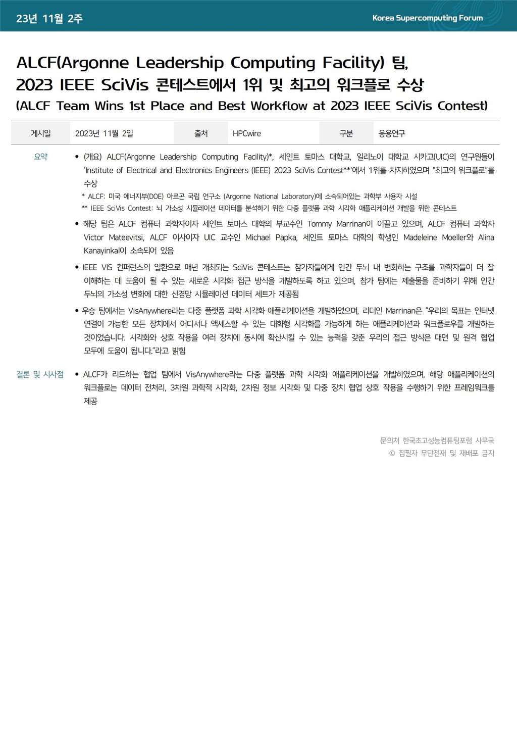 ALCF(Argonne Leadership Computing Facility) 팀, 2023 IEEE SciVis 콘테스트에서 1위 및 최고의 워크플로 수상