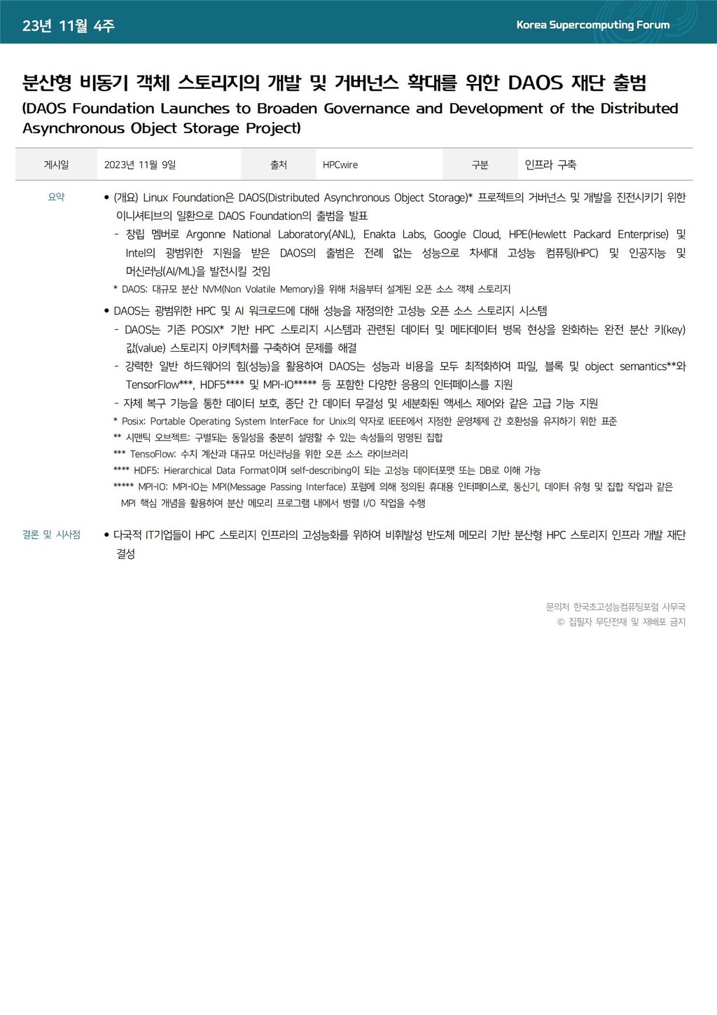 분산형 비동기 객체 스토리지의 개발 및 거버넌스 확대를 위한 DAOS 재단 출범