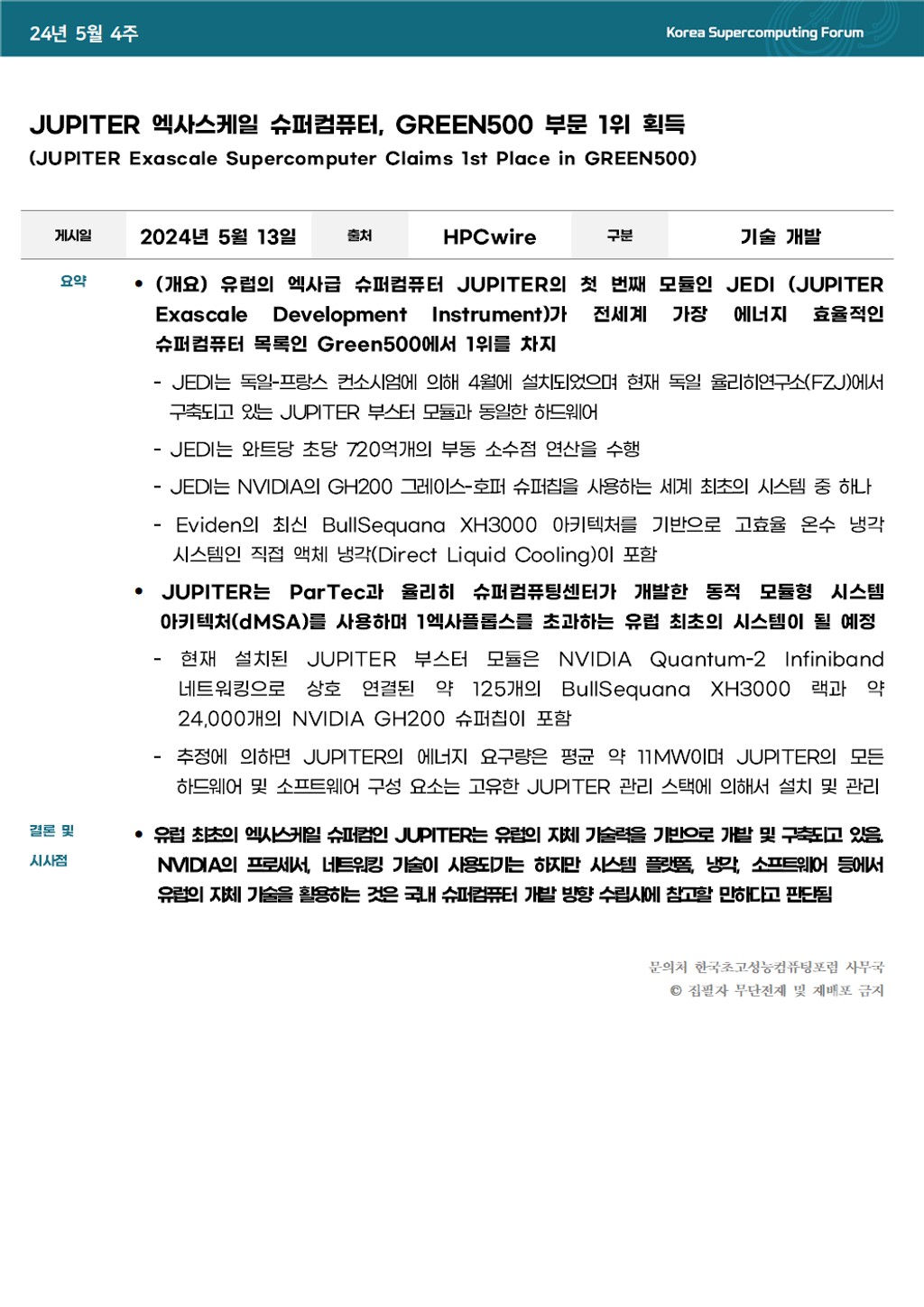 JUPITER 엑사스케일 슈퍼컴퓨터, GREEN500 부문 1위 획득