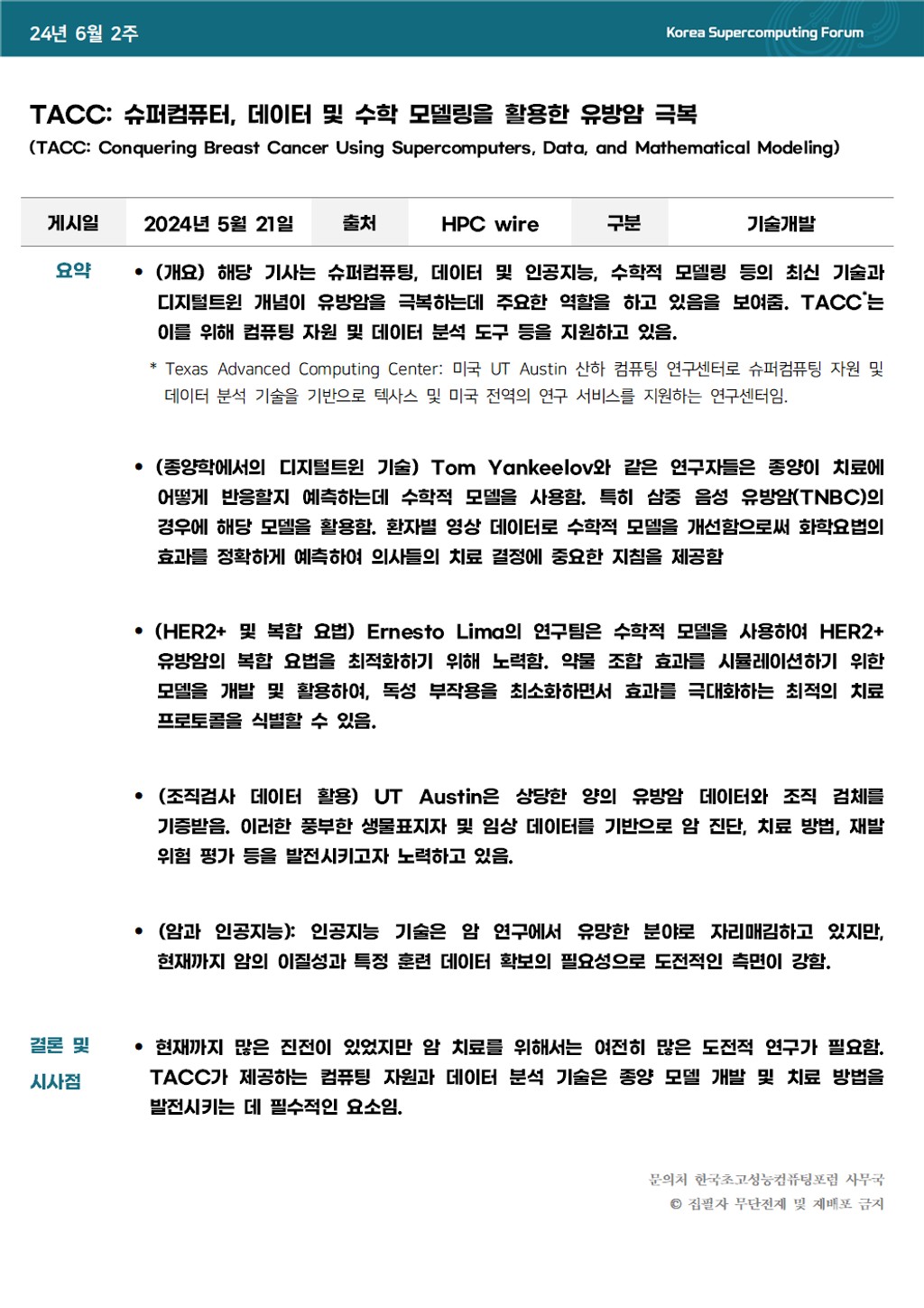 TACC: 슈퍼컴퓨터, 데이터 및 수학 모델링을 활용한 유방암 극복