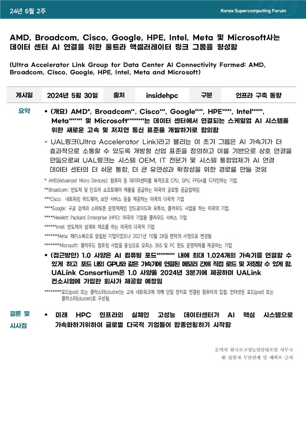 AMD, Broadcom, Cisco, Google, HPE, Intel, Meta 및 Microsoft사는 데이터 센터 AI 연결을 위한 울트라 액셀러레이터 링크 그룹을 형성함