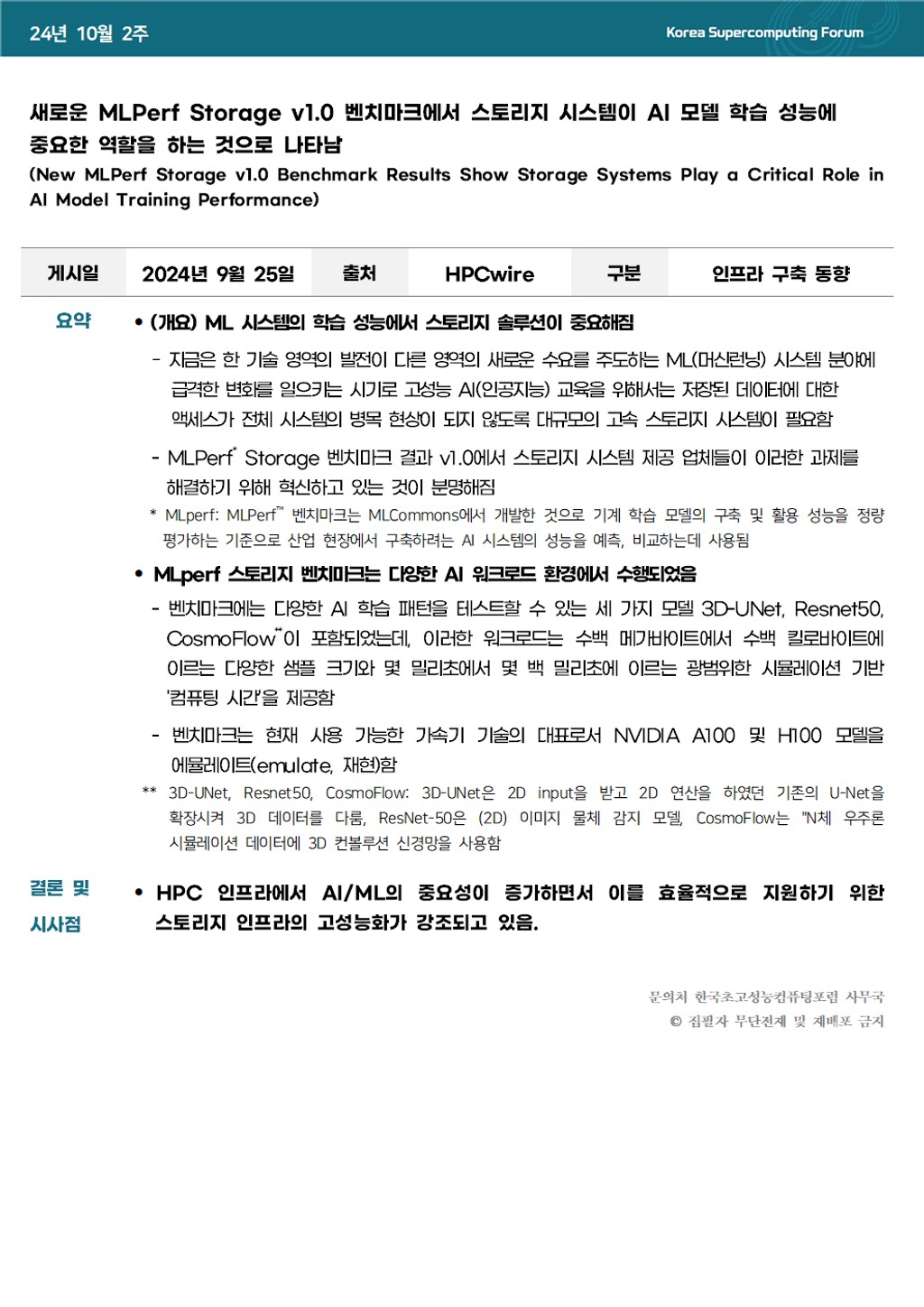 새로운 MLPerf Storage v1.0 벤치마크에서 스토리지 시스템이 AI 모델 학습 성능에 중요한 역할을 하는 것으로 나타남