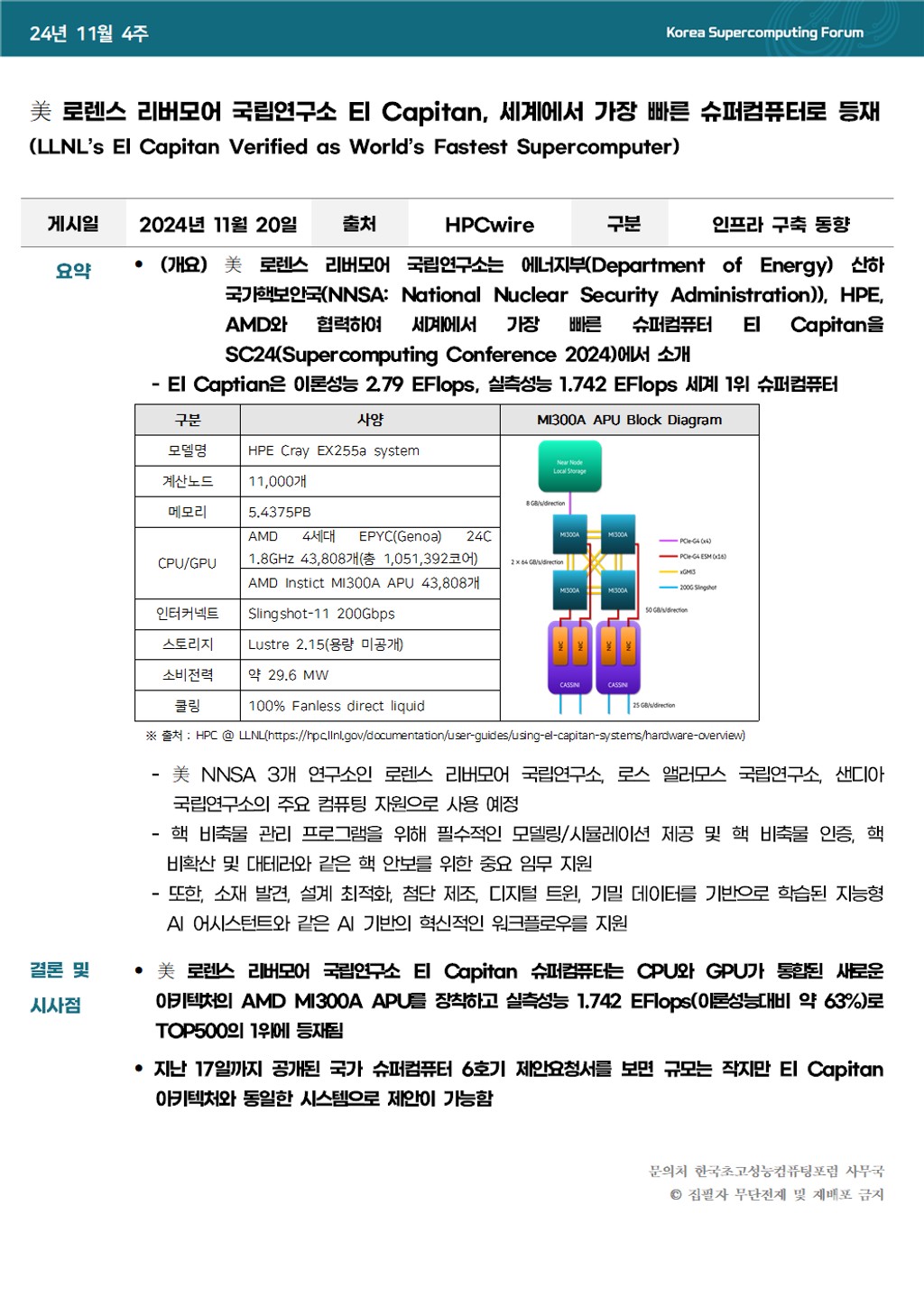 美 로렌스 리버모어 국립연구소 El Capitan, 세계에서 가장 빠른 슈퍼컴퓨터로 등재