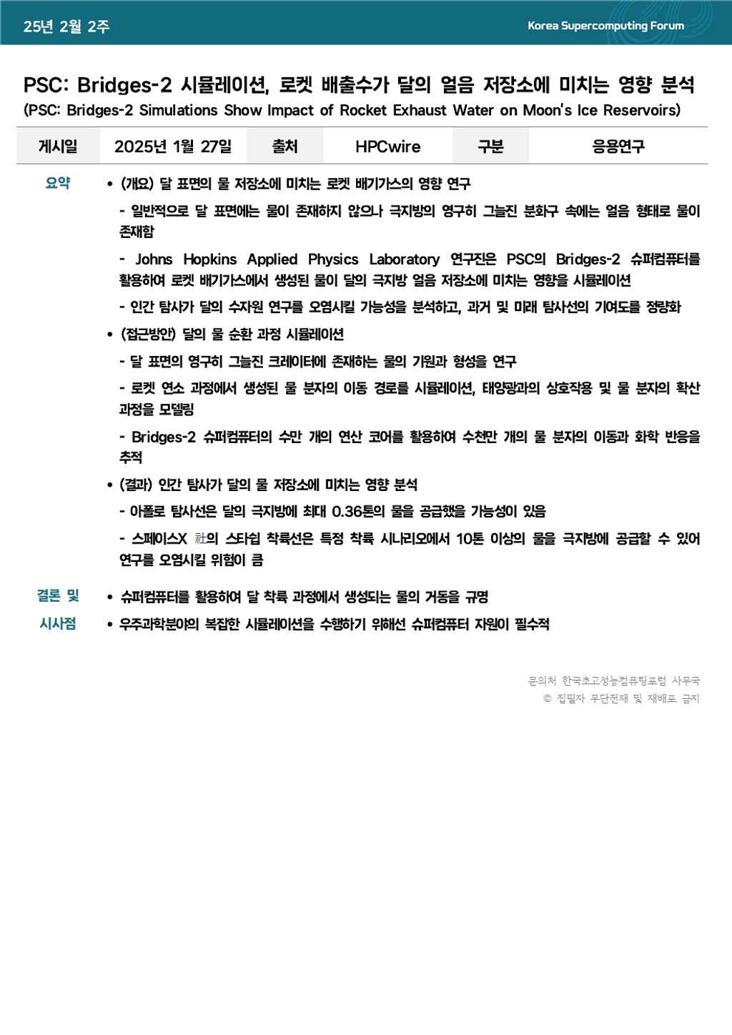 PSC: Bridges-2 시뮬레이션, 로켓 배출수가 달의 얼음 저장소에 미치는 영향 분석