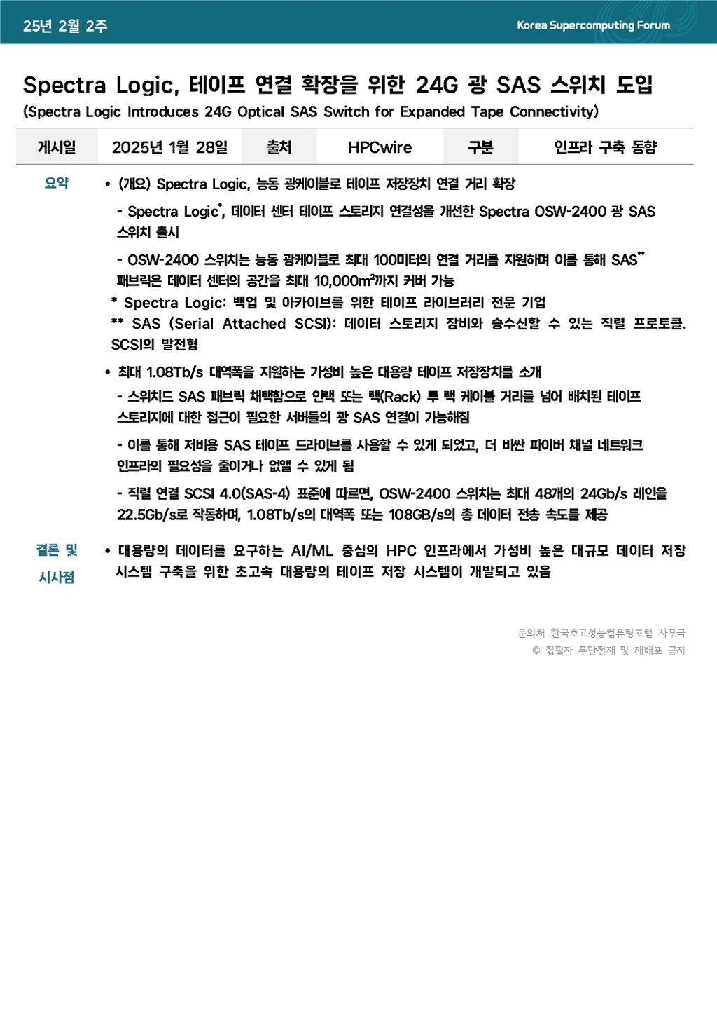 Spectra Logic, 테이프 연결 확장을 위한 24G 광 SAS 스위치 도입