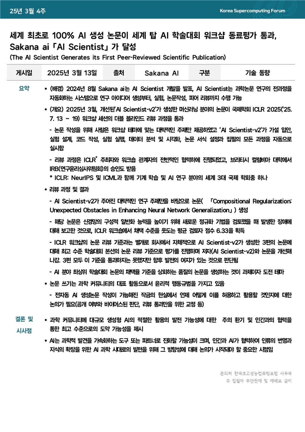세계 최초로 100% AI 생성 논문이 세계 탑 AI 학술대회 워크샵 동료평가 통과, Sakana ai「AI Scientist」가 달성