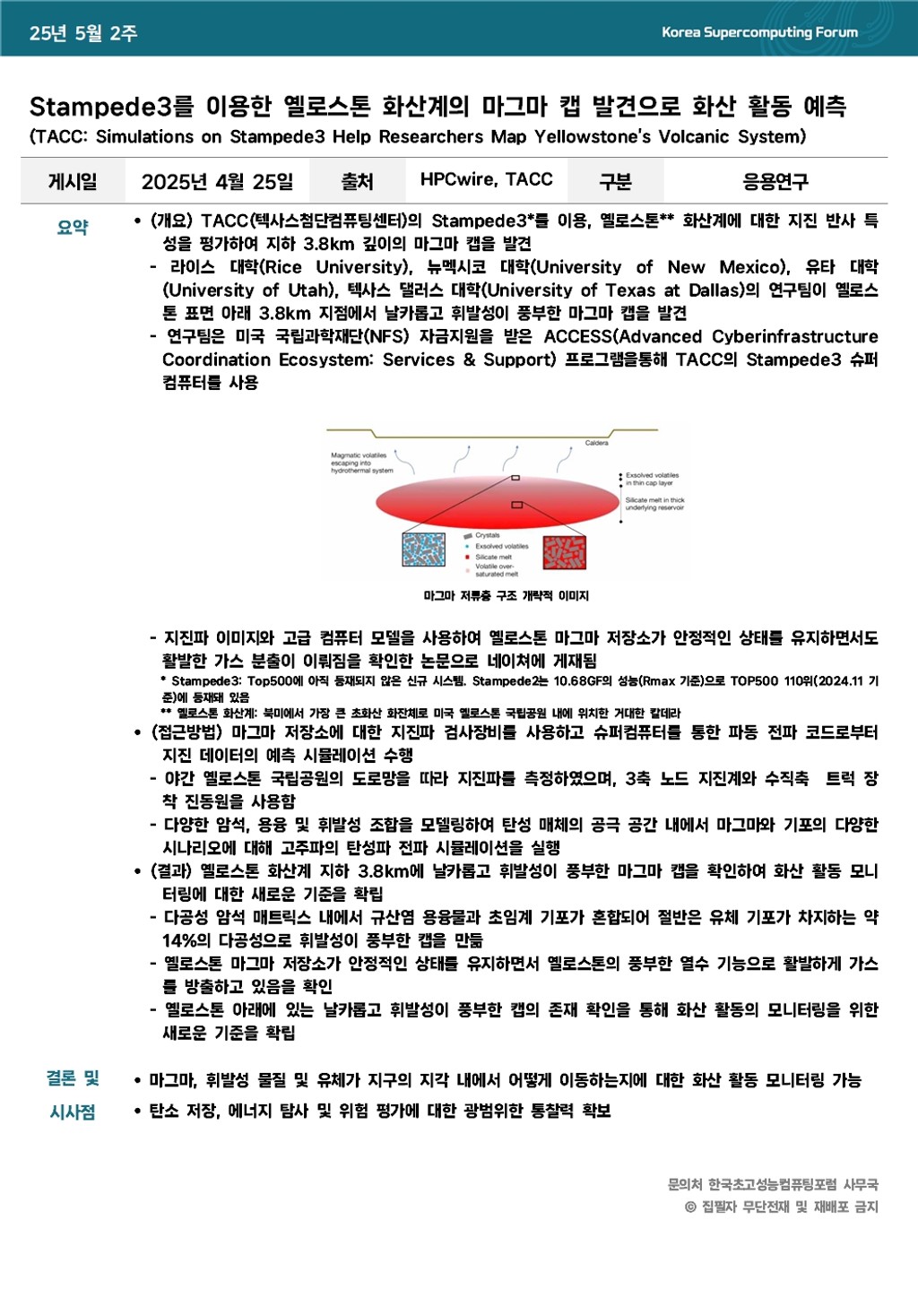 Stampede3를 이용한 옐로스톤 화산계의 마그마 캡 발견으로 화산 활동 예측