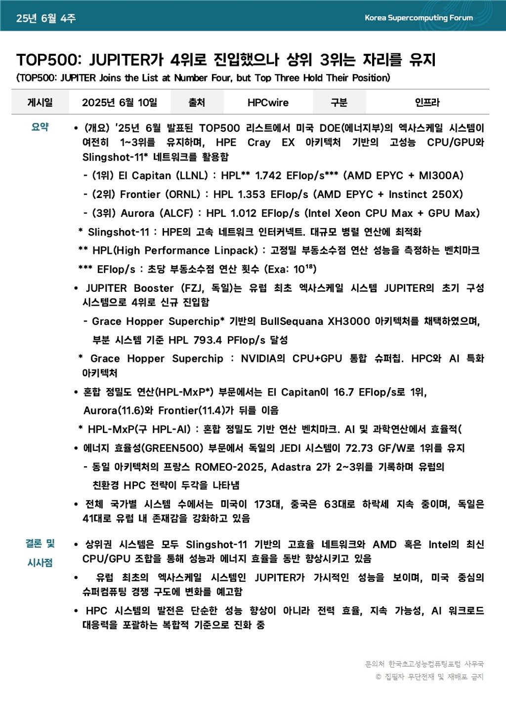 TOP500: JUPITER가 4위로 진입했으나 상위 3위는 자리를 유지