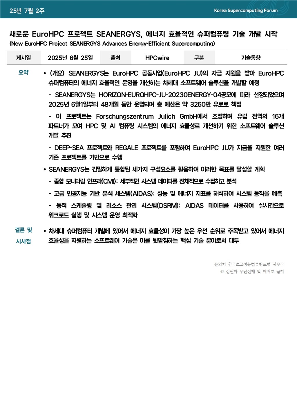 새로운 EuroHPC 프로젝트 SEANERGYS, 에너지 효율적인 슈퍼컴퓨팅 기술 개발 시작