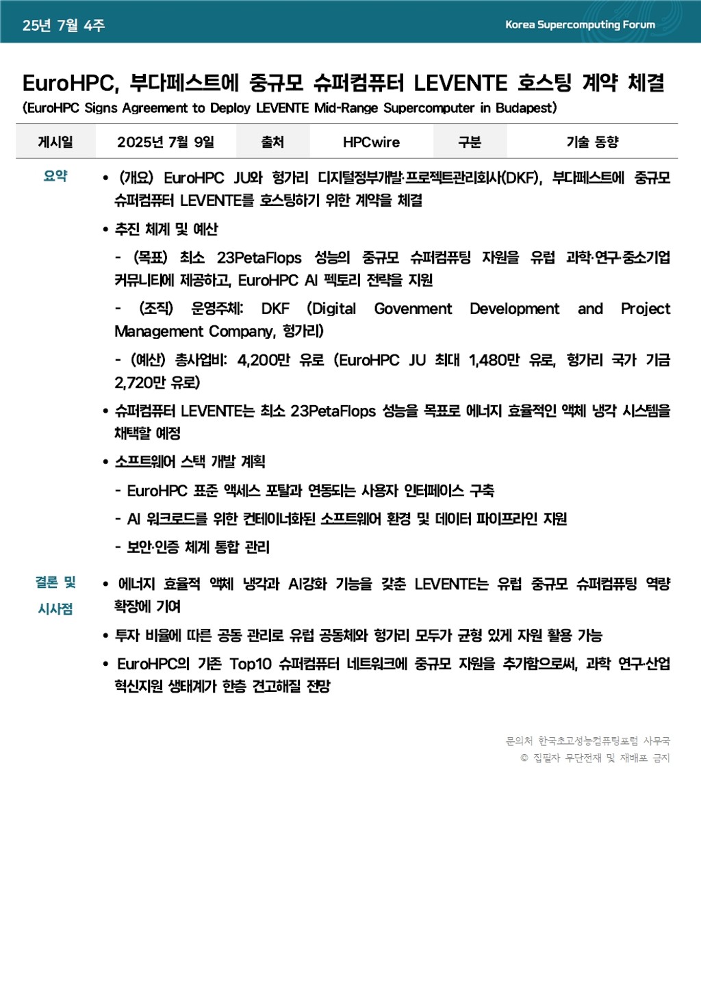 EuroHPC, 부다페스트에 중규모 슈퍼컴퓨터 LEVENTE 호스팅 계약 체결