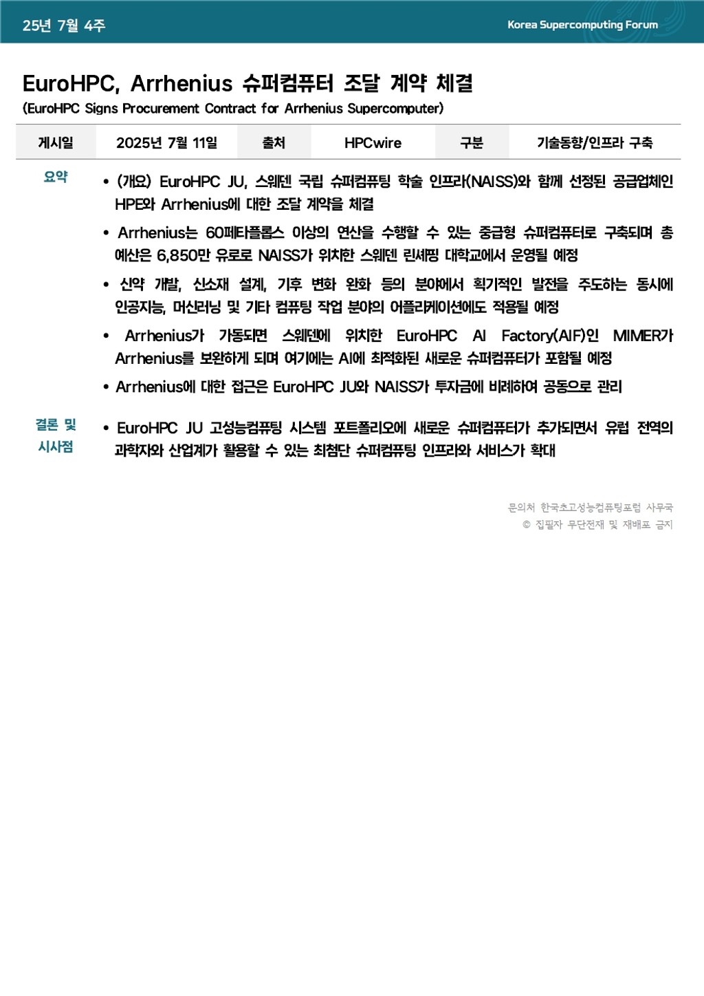 EuroHPC, Arrhenius 슈퍼컴퓨터 조달 계약 체결