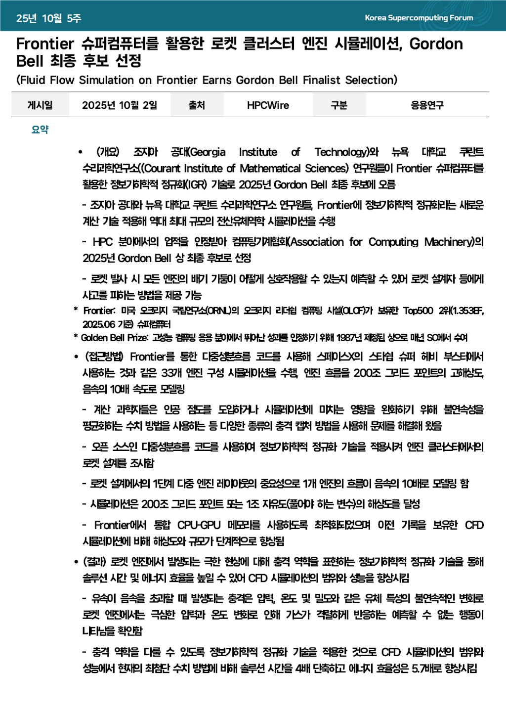 Frontier 슈퍼컴퓨터를 활용한 로켓 클러스터 엔진 시뮬레이션, Gordon Bell 최종 후보 선정