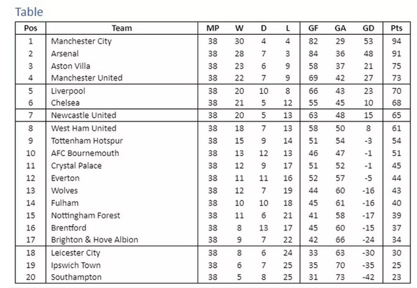 슈퍼컴퓨터의 시즌 순위 예상도 맨시티의 우승을 예상했다. 영국 '맨체스터 이브닝 뉴스'는 슈퍼컴퓨터의 분석을 바탕으로 2024-25시즌 예상 순위를 전했다.