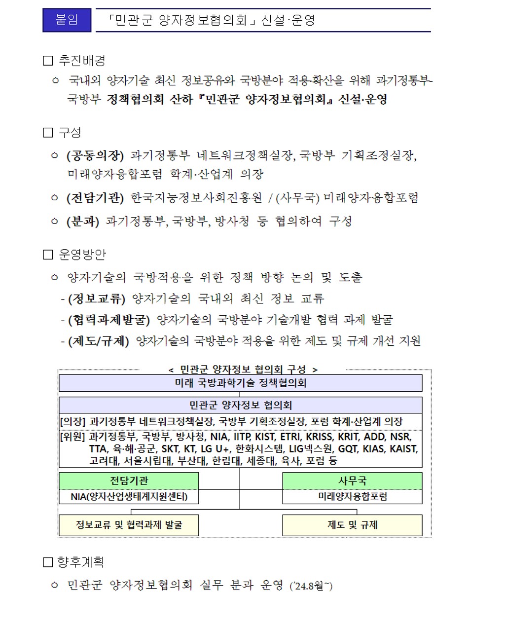 이러한 노력에 더하여 양자과학기술의 빠른 개발과 국방적용을 지원하는 부처간 강력한 연계 및 협력체계를 구축하고자 과기정통부-국방부 주관 「민관군 양자정보협의회」를 출범하게 되었다. 이는 2024년 4월 체결한 과기정통부·국방부 장관간 국방과학기술 협력 MOU 후속조치로서 양자과학기술 개발과 산업창출, 국방혁신의 선순환 구조를 구축하는 데 기여할 것으로 기대된다.