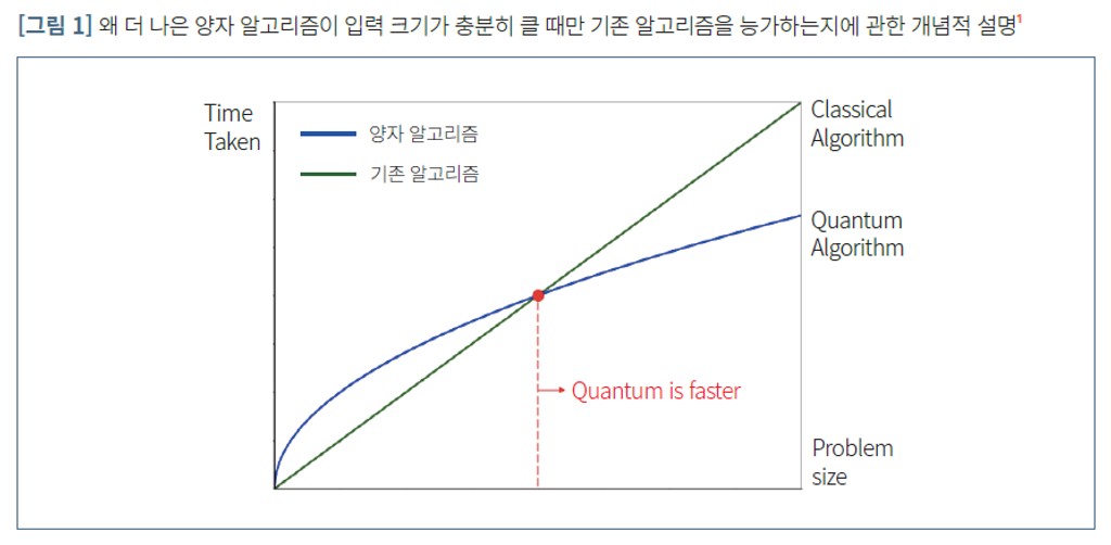 [그림1]은 알고리즘 성능에 대한 기존 알고리즘(Classical Algorithm)과 양자 알고리즘(Quantum Algorithm)의 경쟁을 개념적으로 보여준다. Y축은 시간이 얼마나 걸리는지를, X축은 입력데이터의 크기를 나타내는데, 같은 기능을 가진 알고리즘이 기존방식이나 양자방식에 따라서 그 성능이 다를 수 있음을 보여주고 있다. 특히, 이 모델은 초기에는 기존 알고리즘의 성능이 우수하지만, 시간이 지나 특정 입력 데이터 크기를 지났을 경우는 양자 알고리즘이 더 우수하다는 것을 나타내고 있다