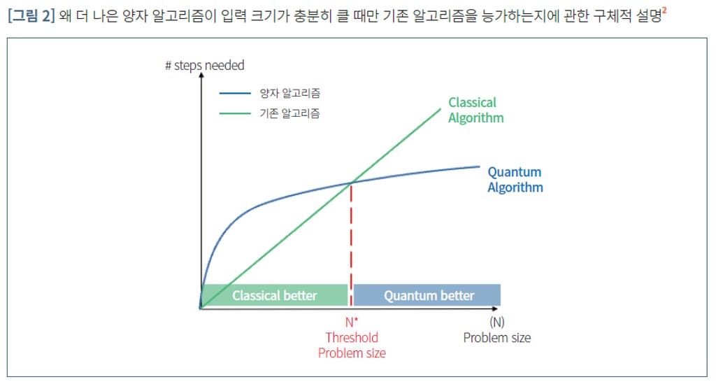 좀 더 구체적이면서 기술적 설명을 위해 [그림 2]에서 Algorithm 1은 개의 입력 데이터 사이즈를 가지고 있고, Algorithm 2는 1,000,000 이 있다고 가정하자. 그림과 같이 하나는 기존 알고리즘(Classical Algorithm)을 가리키고, 다른 하나는 양자 알고리즘(Quantum Algorithm)을 가리키며, 특정 입력 데이터 크기에서 양자알고리즘이 더 빨라지는 것을 볼 수 있다.