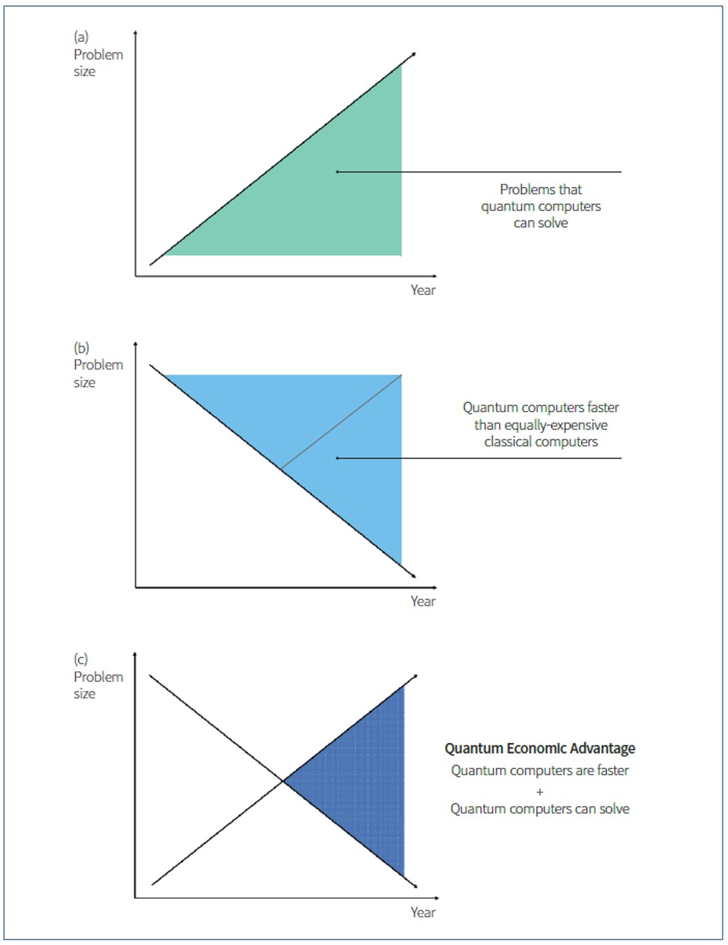 [그림 3(a), (b), (c)] 양자 경제적 우위가 발생하는 시점에 대한 도식적 표현으로, 다음을 포함한다. (a)실행 가능성: 양자컴퓨터가 특정 문제 크기를 해결할 만큼 충분히 강력한 경우 (b)알고리즘적 이점: 더나은양자알고리즘이고전컴퓨터의 속도 이점을 극복할 만큼 충분한 이점을 제공하는 경우 이 제약 조건들을 종합하면 (c)양자 경제적 우위의겹치는영역이 나타난다.