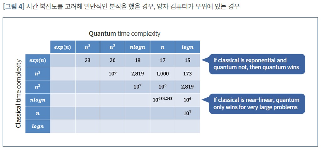 [그림 4] 안의 숫자의 값들은 기존 시간 복잡도와 양자 시간 복잡도의 차이를 바탕으로 N* 값을 구했을 때 나오는 값들이다. 만약에 기존 시간 복잡도가 지수적인 크기이고 양자 시간 복잡도가 아니라면, 양자 컴퓨팅이 경제적 우위를 차지할 것이다. 하지만, 기존 시간 복잡도가 선형적 값을 보인다면, 양자 컴퓨팅이 경제적 우위를 갖는 경우는 아주 큰 입력 데이터 크기일 경우만일 것이다.