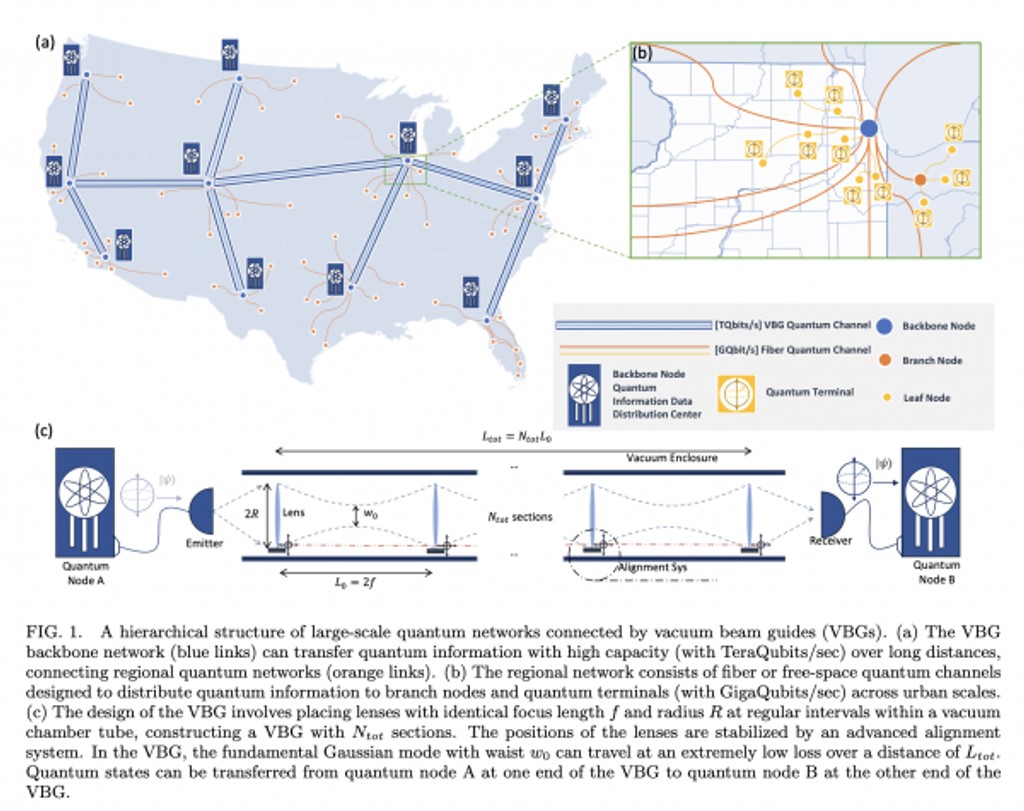 시카고 대학이 이끄는 팀은 진공 빔 가이드를 사용하는 그들의 접근 방식이 기존 파이버 접근 방식보다 훨씬 더 뛰어나며 반복기의 필요성을 줄일 수 있다고 주장합니다. 다음은 그들의 논문(대규모 양자 네트워크를 위한 진공 빔 가이드)의 초록입니다.