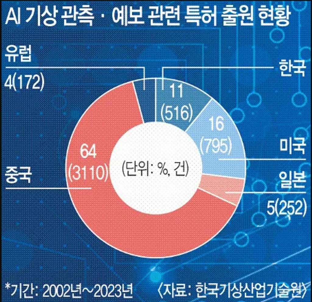 이상기후에 따라 기상 예보 수요가 높아지는 만큼 각국은 기술 경쟁을 치열하게 벌이고 있다. 특허 출원 건수로 보면 중국이 압도적으로 많다. 한국기상산업기술원에 따르면 2002년부터 지난해까지 중국의 특허 출원 건수는 3110건으로, 전체 특허 건수의 64%를 차지하며 1위에 올랐다. 미국은 795건, 한국 516건, 일본 252건, 유럽 172건 등으로 집계됐다. 활발한 특허 출원은 기상 예보 시장이 급성장할 것으로 전망되는 데 따른 것으로 풀이된다. 기상 예보 서비스 시장은 2021년 3조7597억원에서 2028년 7조1071억원으로 배 가까이 성장할 전망이다.