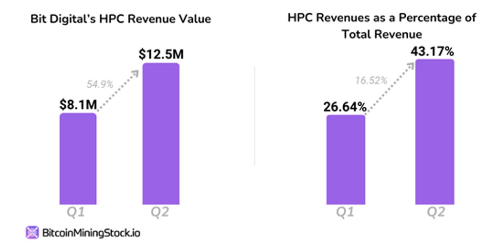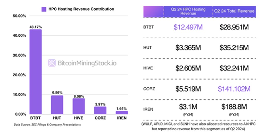 반감이 전에 많은 비트코인 채굴자들이 공격적으로 해시레이트 확장을 추구하는 것이 목격되었으며 이 트렌드는 계속되고 있습니다. 한편, 일부 채굴자들은 HPC(고성능 컴퓨팅) 및 AI 부문으로 다각화하고 있습니다. 비트 디지털은 처음에 공공 채굴자들이 금광을 어떻게 활용하고 있는지 분석하면서 제 주목을 끌었습니다. 상당한 미디어 주목을 끌어온 코어 사이언티픽의 CoreWeave와 달리, 비트 디지털의 HPC 사업은 눈에 띄지 않게 운영되고 있지만 여전히 매우 수익성은 높습니다. 그들의 HPC 수익은 1,249만 7000달러에 달했으며, 이는 전체 수익의 43.17%를 차지합니다. 동료들 중 AI 분야를 주도하고 있습니다.
