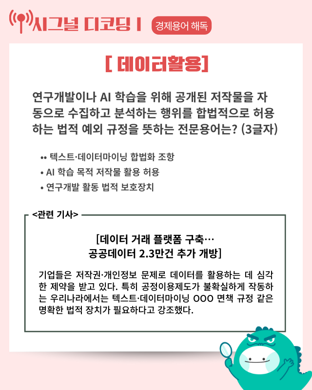 - 핵심 요약: 정부가 인공지능(AI) 학습용 데이터를 합리적으로 거래할 수 있는 데이터 거래 플랫폼을 구축한다. 나아가 공공부문이 보유한 데이터를 기업들이 자유롭게 활용할 수 있도록 데이터를 폭넓게 개방할 방침이다. 이재명 대통령은 15일 주재한 제1차 핵심규제 합리화 전략회의에서 “데이터는 AI 경쟁력의 핵심 자산인 만큼 법적 불확실성과 과도한 규제로 기업이 어려움을 겪지 않도록 제도적 틀을 조속히 마련하라”고 관계 부처에 지시했다. 이날 회의에서는 정부 부처와 학계·업계 관계자들이 참석해 AI 3강 도약을 위한 데이터 규제 개선 방안을 집중 논의한 것으로 알려졌다. 최경진 한국인공지능법학회 회장은 주제 발표에서 “기업들은 저작권·개인정보 문제로 데이터를 활용하는 데 심각한 제약을 받고 있다”며 “특히 공정이용제도가 불확실하게 작동하는 우리나라에서는 텍스트·데이터마이닝(TDM) 면책 규정 같은 명확한 법적 장치가 필요하다”고 강조했다. 현재 정부는 규제 샌드박스를 통해 1만 2000건의 공공저작물을 공개했으며 추가로 2만 3000건의 공공저작물을 공개할 계획이다.