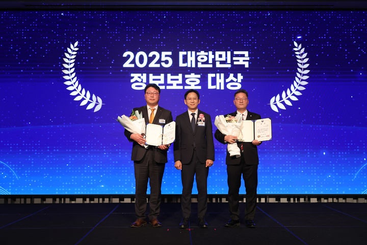 [서울=뉴시스] 정병혁 기자 = 배경훈 부총리 겸 과학기술정보통신부 장관이 9일 오후 서울 강남구 노보텔앰배서더호텔에서 열린'2025정보보호산업인의 밤' 에서 수상자들과 기념촬영을 하고 있다.(사진=과학기술정보통신부 제공) 2025.12.09.photo@newsis.com