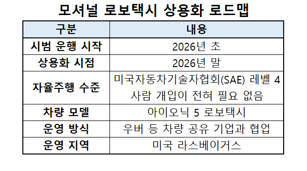 현대차그룹은 무인 택시 사업의 국내 도입 가능성도 열어뒀다. 김 본부장은 “올해 말 라스베이거스 상용화를 성공적으로 마무리한 뒤, 축적된 기술과 운영 경험을 바탕으로 한국을 포함한 다양한 지역 전개를 검토할 것”이라고 말했다.