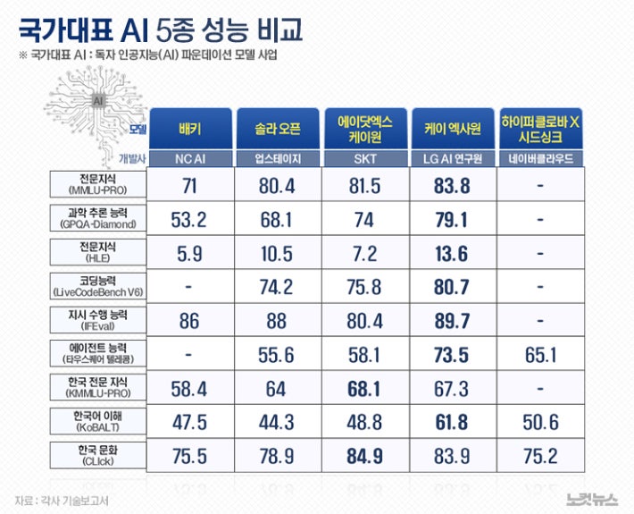 이들 기술보고서에 포함된 벤치마크 테스트 결과를 비교한 결과, 전반적인 성능 지표에서는 LG AI연구원의 'K-엑사원'이 가장 앞선다는 평가가 나온다. 대학원 수준의 전문 문제 해결 능력을 측정하는 항목인 전문지식(MMLU-Pro)을 비롯해 과학 추론 능력을 평가하는 GPQA-Diamond, 코딩 역량을 보는 라이브코드벤치(LiveCodeBench V6) 등 주요 지표에서 경쟁 모델 대비 가장 높은 점수를 기록했다.